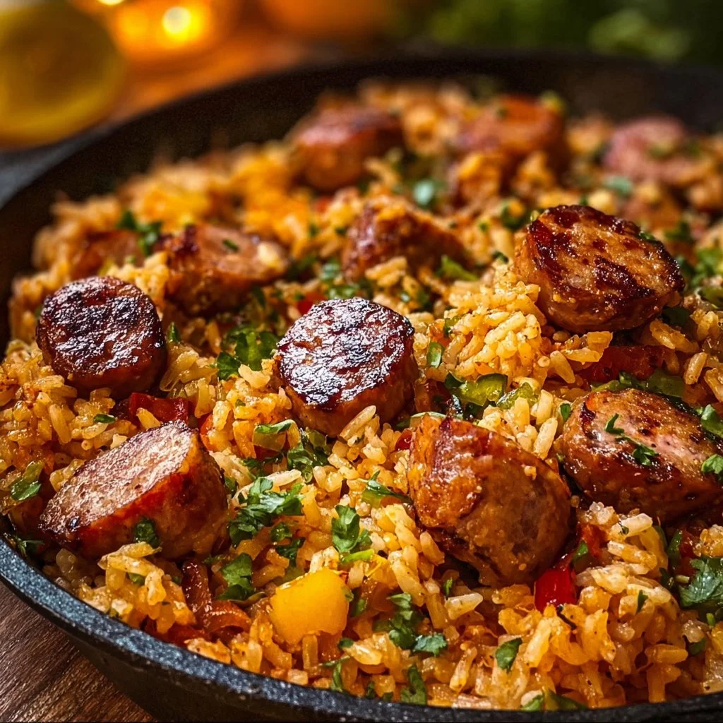 A quick and flavorful Cajun dish combining smoked sausage, rice, and colorful vegetables, all cooked in one skillet.