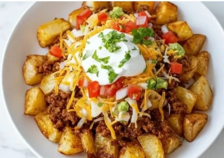 Cheesy Taco Potatoes are the ultimate comfort food with crispy potatoes, seasoned beef, and gooey cheese, perfect for weeknight dinners or game day gatherings.