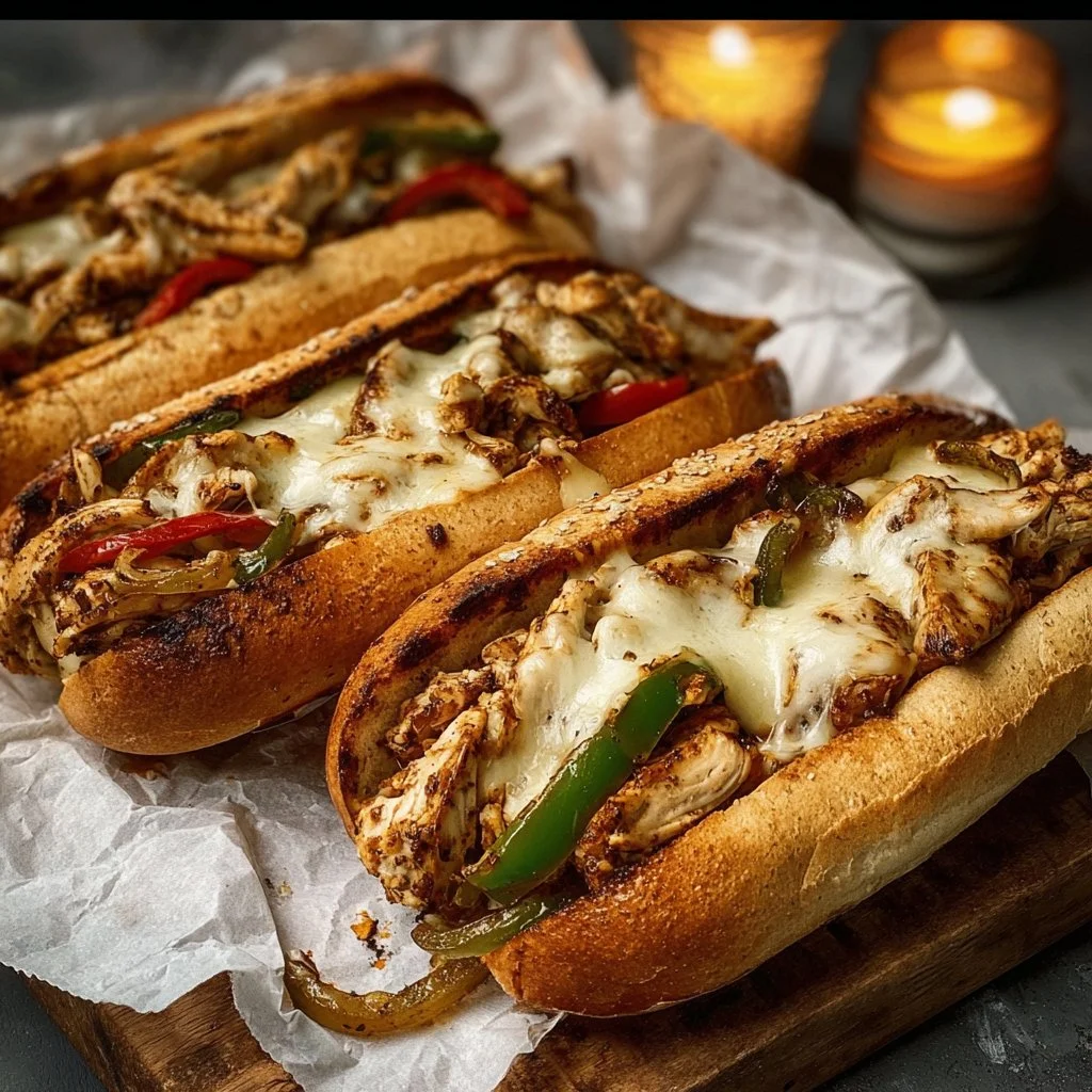 A hearty and comforting dish featuring juicy chicken, colorful bell peppers, and melted provolone cheese, all in soft hoagie rolls.