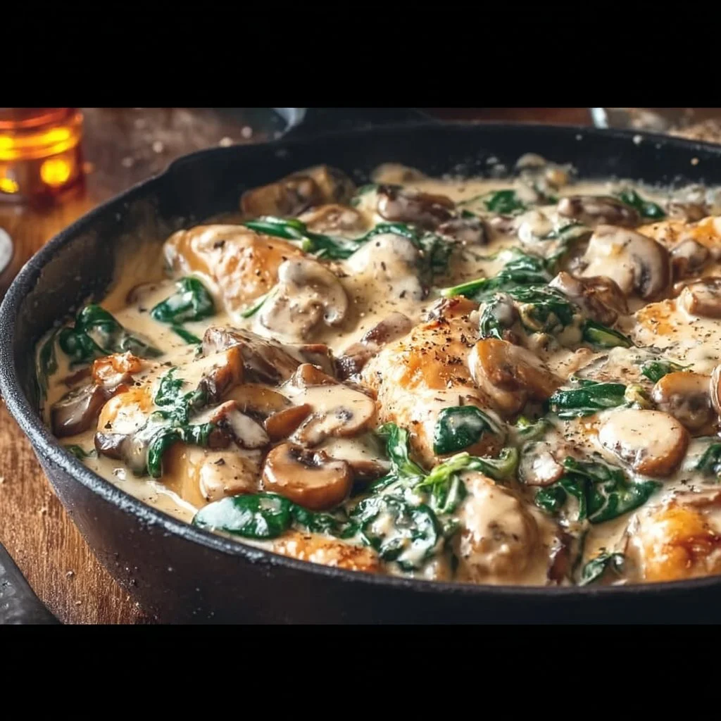 A comforting one-pan dish featuring tender chicken, mushrooms, and spinach in a creamy sauce, perfect for weeknight dinners.