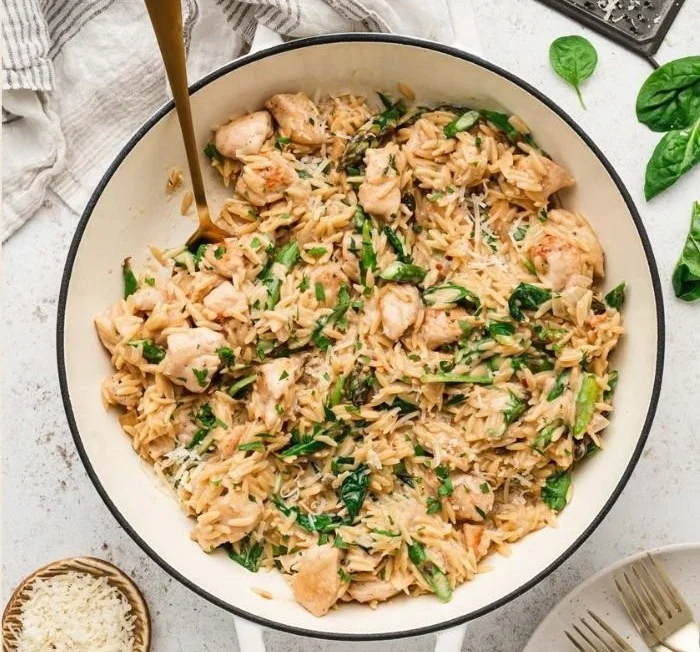 A delightful one-pot meal that combines orzo pasta, tender chicken, and vibrant asparagus, delivering a creamy and nutritious dish perfect for busy weeknights.