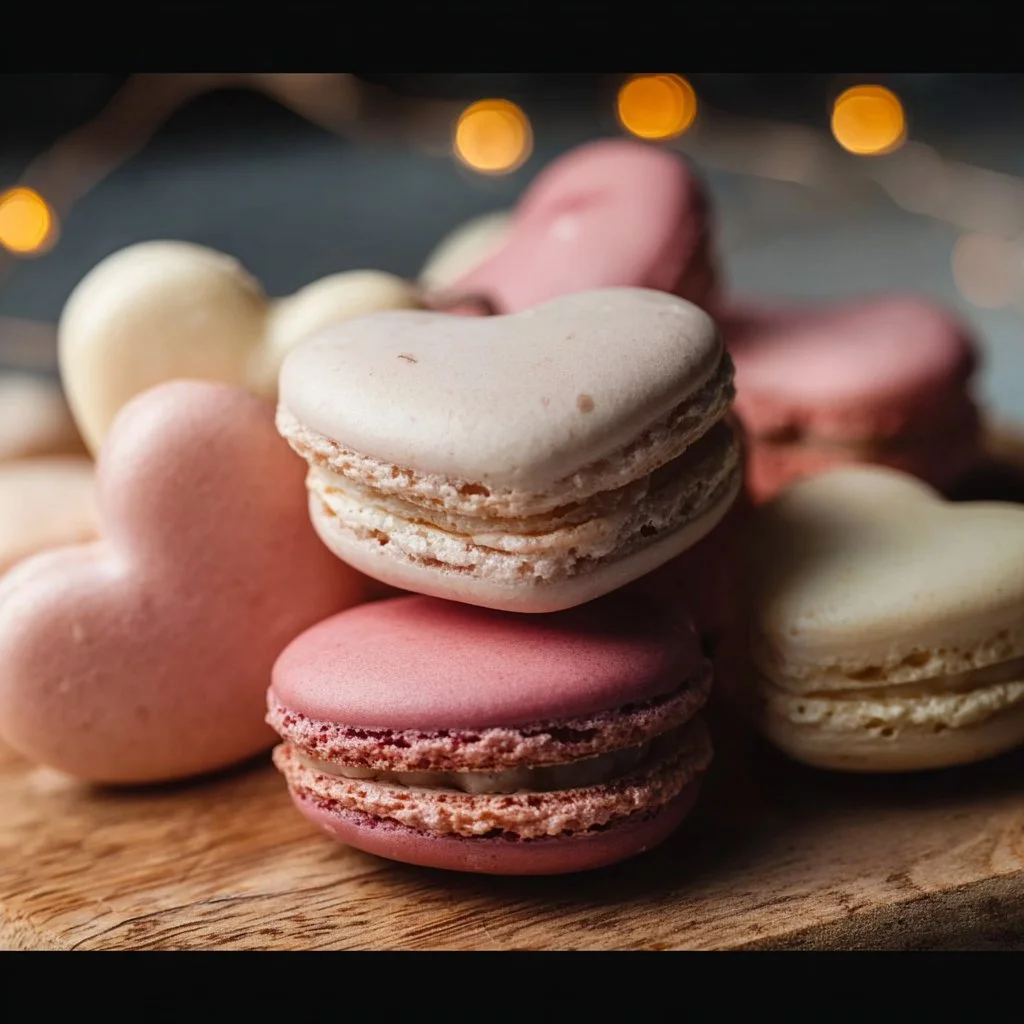 Delicate heart-shaped macarons with a crispy exterior and rich buttercream filling, perfect for special occasions.
