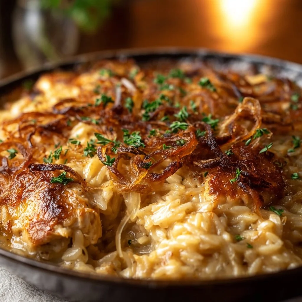 French Onion Chicken Orzo Casserole