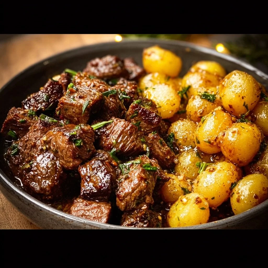 Comforting dish with tender beef bites in garlic butter sauce, paired with buttery baby potatoes.