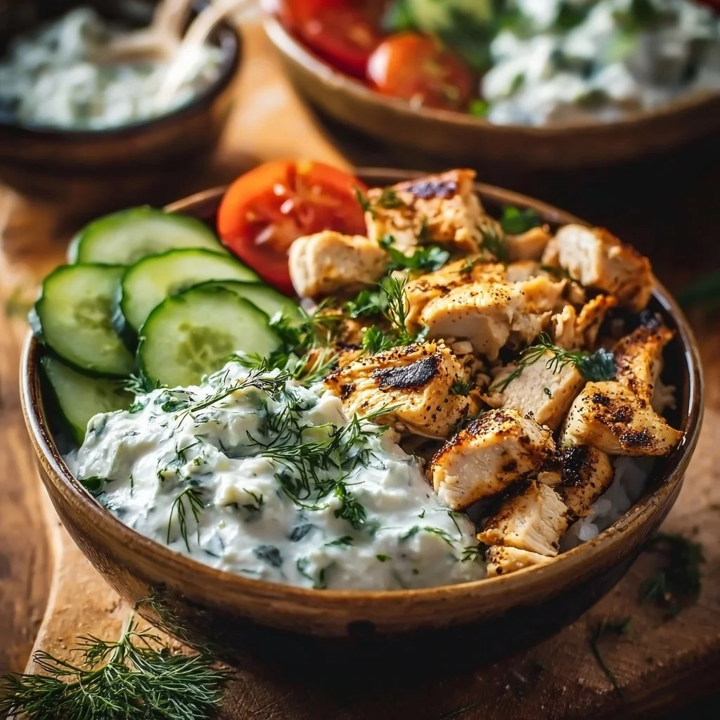 Delicious Chicken Tzatziki Bowls featuring grilled chicken, creamy tzatziki, fresh vegetables, and a choice of rice or quinoa.