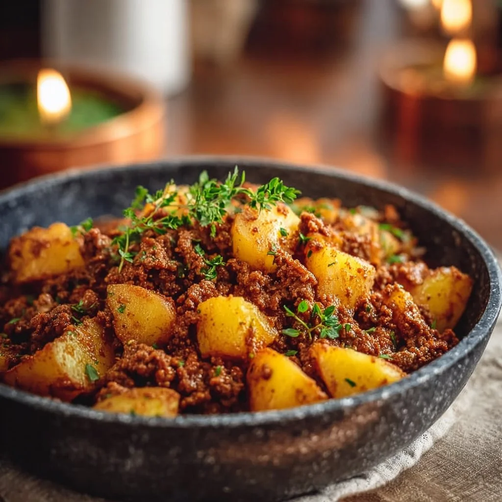 Hearty ground beef and potatoes dish served on a plate with fresh herbs