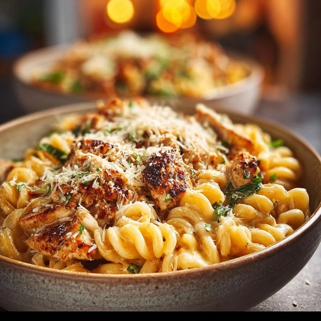 A creamy pasta dish packed with protein, combining tender penne or rigatoni with grilled chicken and a luscious garlic parmesan sauce.