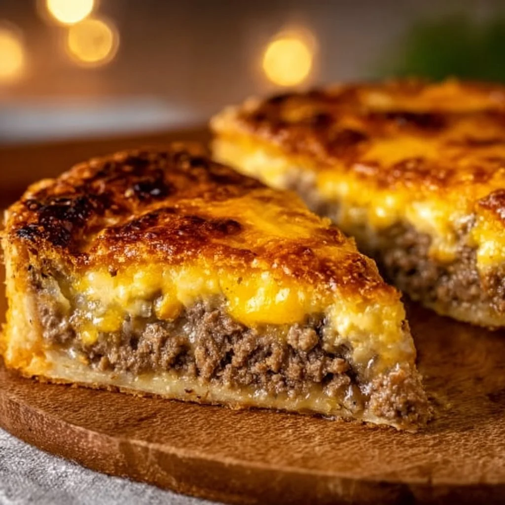 A delightful pie that combines the classic flavors of a cheeseburger, featuring savory ground beef, melted cheddar cheese, and a fluffy custard-like filling.
