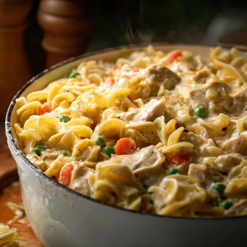 A comforting mix of egg noodles, shredded chicken, and mixed vegetables in a creamy sauce, topped with flaky biscuit dough.