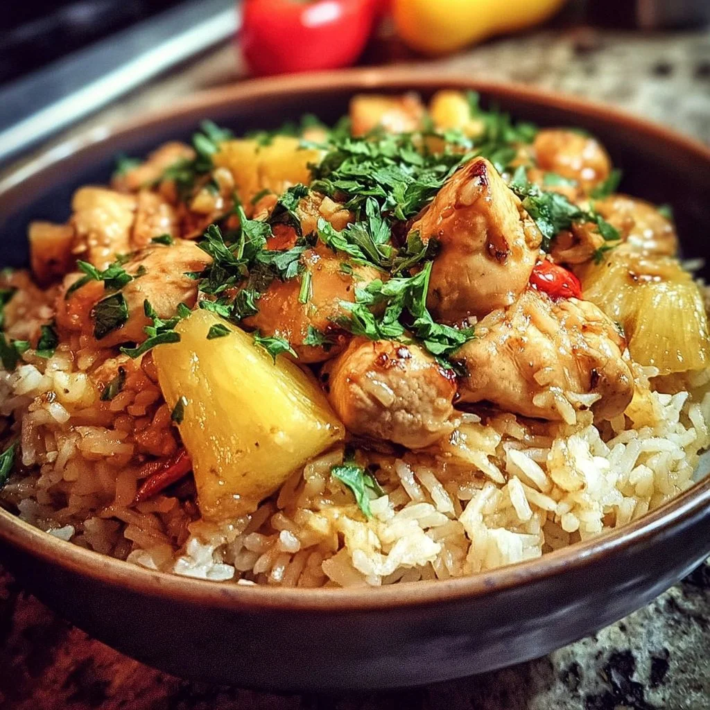 A vibrant dish that fuses savory chicken with sweet pineapple, enveloped in comforting rice.