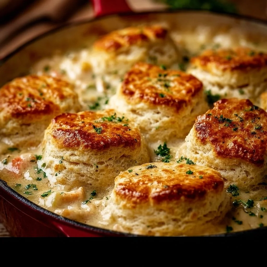 A delightful fusion of creamy chicken filling and flaky, buttery biscuit topping, perfect for cozy dinners.