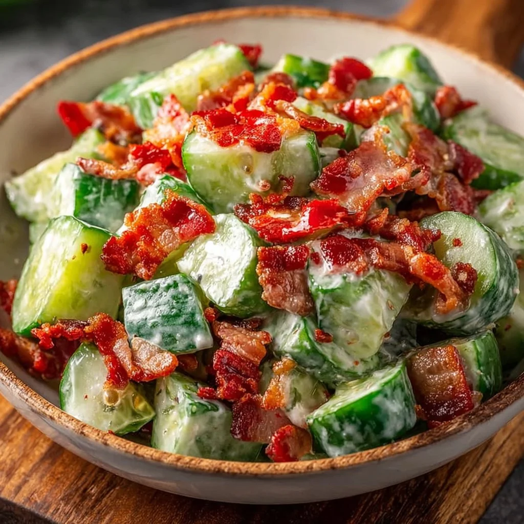 A refreshing and indulgent cucumber salad topped with crispy bacon, feta cheese, and a zesty dressing, perfect for summer lunches or potlucks.