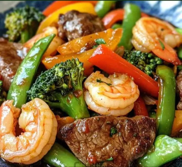 - Combine and Serve: Return the steak and shrimp to the skillet with the vegetables. Toss everything together for 1-2 minutes to heat through. Serve hot, garnished with chopped green onions and sesame seeds.