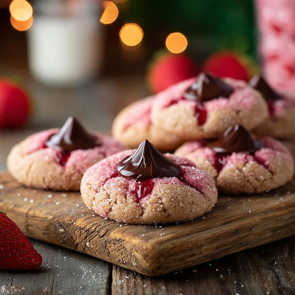 Delightful strawberry-flavored cookies topped with a chocolate kiss, perfect for any occasion.