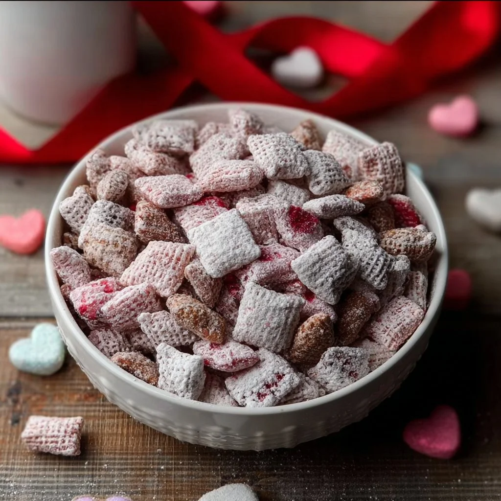 A playful twist on the classic snack mix featuring delightful pink and red candy melts, perfect for celebrating Valentine’s Day.